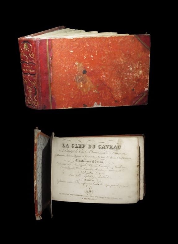 Exemplaire revêtu d'une jolie reliure du temps à décor romantique. ''La Clef du caveau permet de retrouver la musique correspondante, lorsqu'on trouve la mention "sur l'air de..." avant le texte d'une chanson.'' Barbier I, Dictionnaire des ouvrages anonymes, 615-d (pour des éditions de 1811 et 1827) - Quérard I, Supercheries littéraires, 608 - Quérard II, La France littéraire, p. 44. Angles élimés. Abrasions affectant les plats. Petit manque angulaire affectant le premier feuillet. Rousseurs et cernes dans le corps d'ouvrage. Papier en outre souvent oxydé. L'ensemble demeurant cependant parfaitement lisible. Peu courant.