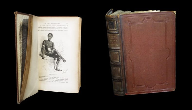 Edition originale de la traduction française recelant de nombreuses illustrations in et hors-texte. En mars 1861, White Baker entame son premier voyage d'exploration en Afrique centrale. C'est, d'après ses propres termes, «pour découvrir les sources du Nil, avec l'espoir de rejoindre l'expédition est-africaine des capitaines Speke et Grant quelque part aux environs du Lac Victoria». Après une année passée sur la frontière entre le Soudan et l'Abyssinie, à apprendre l'arabe, à explorer la rivière Atbarah et d'autres affluents du Nil, à prouver que les sédiments du Nil proviennent d'Abyssinie, il arrive à Khartoum qu'il quitte en décembre 1862 pour remonter le Nil Blanc. Deux mois plus tard, il rencontre Speke et Grant à Gondokoro, qui après avoir découvert les sources du Nil, redescendent le fleuve vers l'Égypte. Leur succès lui fait craindre qu'il n'y a plus rien à faire d'important pour sa propre expédition, mais les deux explorateurs lui fournissent suffisamment d'informations pour lui permettre d'entreprendre l'exploration d'un grand lac encore inconnu des européens. Samuel Baker découvre alors l'Albert Nyanza ou Lac Albert le 14 mars 1864. Après avoir exploré les environs du lac et démontré que le Nil le traverse, il entame son retour et rejoint Khartoum en mai 1865. Angles émoussés. Coiffes élimées. Papier oxydé. Présence de rousseurs dans le corps d'ouvrage , davantage marquées aux feuillets liminaires. Petite déchirure en marge du dernier.