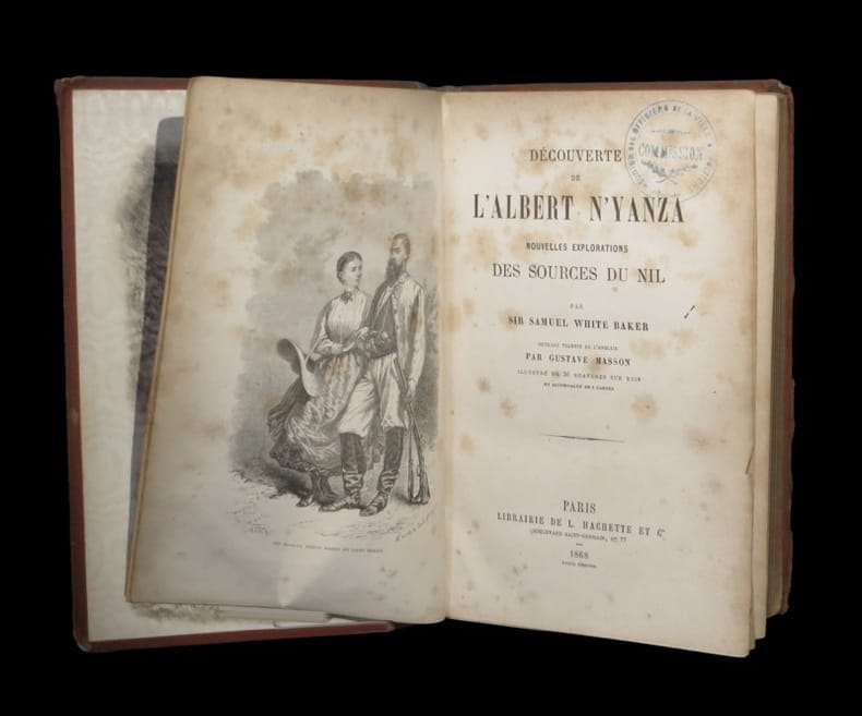Première édition française, traduite de l'anglais par Gustave Masson. Elle est illustrée d'un frontispice, de plusieurs illustrations à pleine page et de 2 cartes hors texte.Une exploration des sources du Nil effectuée à partir de 1862 sur les traces de l’expédition de Speke (et de la précédente en 1855-59 par Burton et Speke). Baker rejoignit les mythiques sources en 1863. Sur les indications de Speke, Baker reconnut le lac Albert N’Yanza (Victoria) et prouva définitivement qu’il se trouvait bien l’origine du grand fleuve. Baker effectua l’expédition à ses frais, accompagné de sa seconde épouse. Pâles rousseurs. Dos légèrement passé.
