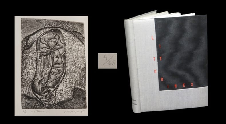 Edition originale. Tirage de tête : un des 25 premiers exemplaires du tirage numéroté sur vélin BFK de Rives ; justifié à la main au colophon. L'ouvrage s'ouvre sur une composition originale gravée à l'eau-forte par Jean-Gérard Gwezenneg ; titrée, justifiée et signée par l'artiste à la mine de plomb. L'exemplaire recèle par ailleurs un bel envoi autographe signé de Michel Besnier en page de titre. ''Associations de mots et d'idées qui sont autant de pudiques ouvertures sur le jardin secret de l'auteur, de discrètes confidences aussi. Le choix des supports pour ces rêve l'apparente à Jean Follain. La métaphore insolite, l'image inattendue appartiennent au langage de Michel Besnier. Son symbolisme l'entraîne dans le sillage de Paul Valéry''. ''Dans sa foisonnante diversité, l'oeuvre de Gwezenneg affirme ainsi l'unité de son inspiration : comme l'édification d'un mode à l'image de l'âme, tel que son extériorité soit le visage exact de son intériorité et tel que le pacte qui le lie à la mort soit également celui qui célèbre et perpétue sa naissance, dans l'éternel enchantement de la germination''. (Claude Louis-Combet). Très belle condition.