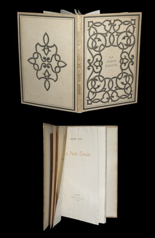 Le 13 juin 1905, Gide note dans son Journal «Chaque jour j'ai pu avancer de quelques lignes ma Porte étroite. Cette assiduité au travail m'est préférable aujourd'hui à la plus belle inspiration du monde », même si il se plaindra de la lenteur avec laquelle il progresse dans l'écriture de ce texte «Je passe des heures sur un groupe de phrases que je bouleverserai le lendemain. La scène, dans la chambre de Geneviève [...] m'a donné un mal extrême. Mais j'admire à présent tout ce que je suis arrivé à n'y pas dire, à réserver.» Bel exemplaire en reliure du temps signée de Jules-Karl Van West : ce relieur d'origine belge s'installa en 1925 à Saint-Brice-la-forêt, où il fait construire son atelier de reliure. Son épouse Jeanne participait au travail de l'atelier en se chargeant de la marbrure pour la confection de ses demi-reliures de qualité qui seront recherchées par les bibliophiles parisiens des années 20 et 30. En mars 1934, sa célébrité dépassera les frontières grâce à la vente de la bibliothèque Pierre Marteau (Drouot, mars 1934, Georges Andrieux expert), qui présentait un nombre très important de ses reliures. Il en acquit une encore plus grande renommée et se voit offrir par la reine Élisabeth de Belgique le poste de maître-relieur de l'École Supérieure des Arts Décoratifs de Bruxelles, et regagne la Belgique en décembre 1939. Après guerre, il devient professeur de reliure à La Cambre, formant entre autres August Kulche. Van West fut l'un des meilleurs praticiens de son temps, maîtrisant à la fois la reliure, la dorure et la dorure sur tranche, trois disciplines qu'il est rarissime de voir réunies dans les mêmes mains. Il sera également le relieur attitré du château de Beloeil, appartenant aux princes de Ligne, avant d'en être le conservateur ; il publiera, en 1950, ses Mémoires d'un relieur. Elle fût vraisemblablement commandée par celui y apposa son ex-libris : René-Louis Doyon. Libraire, éditeur et écrivain, il débute en 1913 chez Figuière : ses souvenirs de cette maison, de son directeur et du directeur littéraire Alexandre Mercereau, comptent parmi les pages les plus savoureuses qu’il ait laissées sur la vie éditoriale d’avant-guerre. En 1917, il ouvre sa propre librairie qui devient, l’année suivante, une maison d’édition où il y pratique une bibliophilie vivante faites de petits tirages imprimés avec soins, tous à l’enseigne de La Connaissance ; il fait figurer en tête de ses éditions une marque où figure sa devise « On se lasse de tout excepté de connaître ». On lui doit aussi des biographies attentives d’Isabelle Eberhardt, de Joséphin Péladan et de Jehan Rictus. En dépit de la qualité de son travail, son entreprise déclina à partir de 1933. Doyon entre alors chez Denoël qui rachète le fonds de sa maison en 1937 De la bibliothèque de R. L. Doyon (ex-libris) et envoi. Naville, 46, XXVIII.