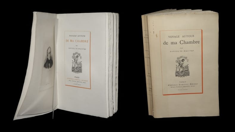 Belle impression sur vergé d'édition. Texte serti d'un joli filet rouge. L'ouvrage - qui a ici conservé de larges témoins - s'ouvre sur un joli portrait-frontispice gravé et recèle par ailleurs de jolis ornements typographiques. Il s'agrémente en outre de 4 jolies eaux-fortes montées sous serpente signées F. Dupont dans la plaque. Récit autobiographique, il dépeint les errements de l'esprit d'un jeune officier contraint à la claustration. Opuscule aux pages spirituelles et vagabondes, il transporte le lecteur dans cette atmosphère aventurière si caractéristique du XVIIIème siècle tout en témoignant de l'influence certaine de Sterne. L'auteur, en une dissertation élégante, pleine de subtilité et de sens cachés, n'a de cesse ici de laisser affleurer son spleen. Mû par la volonté de faire voyager son lecteur au travers ses propres souvenirs, les divagations de de Maistre mettent en fait en lumière la tentative de fuite de l'écrivain face à un monde de contingence. L'avénement du ''moi'' - dans le cadre détourné et parodique d'un récit de voyage - sont ici annonciateurs des prémisses de la révolution romantique ; cela, quoique de Maistre ne se soucia jamais guère que de demeurer à la postérité... Très légères marques d'usage affectant les plats. Très rares autant que discrètes rousseurs dans le texte. Du reste, belle condition.