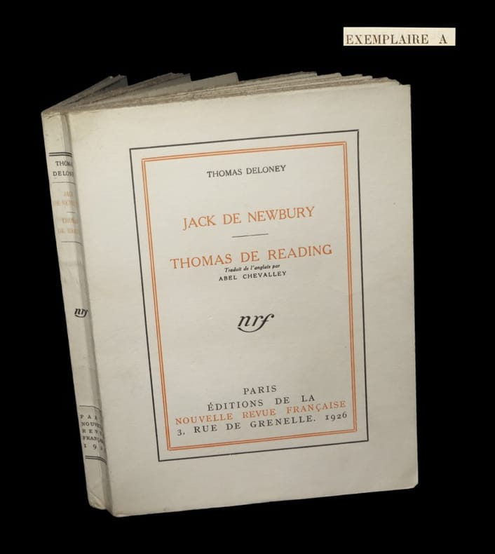 Edition originale de la traduction française. Un des 109 exemplaires réimposés dans le format in-quarto tellière, tirage de tête N° LXXII.Thomas Deloney est un écrivain anglais né en 1543 et mort en avril 1600. Photos sur demande.