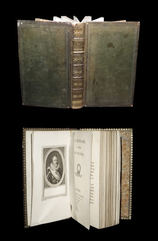 Exemplaire revêtu d'une délicieuse reliure du temps de plein maroquin. Ensemble complet de ses deux parties ; ici reliées en un volume. L'ouvrage s'ouvre sur un frontispice gravé en regard d'une page de titre dessinée par Cochin Fils et gravée par Fessard. Exemplaire en outre ici truffé de 10 figures à pleine-page par Charles Eisen (qui ne devaient primitivement pas figurer dans la présente édition. Reprises d'après l'édition de 1751, elles ont ici été contrecollées en regard de la page liminaire de chacun des Chants). ''Edition dite La Henriade des Damnés en raison d'une note supprimée dans beaucoup d'exemplaires.'' (in Cohen). L'exemplaire s'ouvre - en originale - sur la Préface de Fontenelle ''rédigée pour cette édition. Elle contient la note dite des damnés et celle sur Colbert''. (in L'Oeuvre imprimé de Voltaire à la Bibliothèque nationale). ''C'est pour cette édition que Marmontel composa une Préface qui a été reproduite en tête des principales réimpressions de La Henriade. La seconde partie du volume comprend les variantes et l'Essai sur la poésie épique. C'est dans cette édition que l'on trouve la fameuse note sur le calcul des damnés (p. 138) qui établit qu'on peut compter environ 120000 fois 947 millions êtres humains destinés aux peines de l'Enfer.'' Malgré ses fréquentes infirmités, Voltaire a conduit la Henriade à un point de maturité où je ne sache pas qu'aucun Poëme soit encore parvenu. Jamais la langue française n'eut autant de force que dans la Henriade. Oeuvre emplit d'humanité, on y trouve partout de la noblesse, l'auteur s'élève avec un feu infini jusqu'au sublime, vivacité dans les peintures, force dans les caractères et les descriptions, beauté des sentiments.'' Cohen II, Manuel de l'amateur de livres à gravures du XVIIIème, 1026 - Bengesco I, Bibliographie des Oeuvres de Voltaire, 375 - L'Oeuvre imprimé de Voltaire à la B.n.F., 1705. Dos très légèrement passé. Angles légèrement élimés. Papier parfois légèrement oxydé. Quelques claires et éparses rousseurs dans le texte. Nonobstant, belle condition.