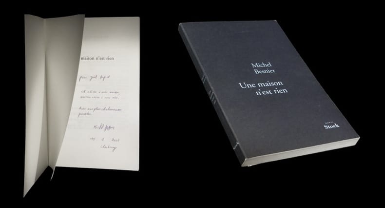 Edition originale (dont il n'est pas fait mention d'un tirage sur grand papier). Exemplaire agrémenté au faux-titre d'un bel envoi autographe signé de Michel Besnier. ''Sa mère partie en maison de retraite, le narrateur décide de ne pas garder la maison de son enfance. Il faut vider et vendre cette maison depuis longtemps sans homme, qui s'abîme et se déglingue. Déplacer, trier, emplir des cartons, aller à la déchetterie, nettoyer, expertiser. C'est le récit de cette épreuve - la maîtriser pour en faire quelque chose au lieu de la subir - qui nous est donné ici, entre désir de mémoire et tentation de table rase. Cet inventaire réveille des souvenirs heureux ou cruels et permet de reconstituer l'histoire familiale : la machine à écrire du père gendarme, le vélo de la mère, la blouse bleue de l'École normale, les jouets, les collections d'enfance que l'on retrouve avec émotion. Ou pire, les objets que l'on cherche en vain, perdus ou jetés, comme les photos détruites par le père. Chaque famille a ses secrets et l'on devine ici que « la maison du père » n'a pas toujours été un havre de bonheur. Mais le narrateur veut effacer l'ardoise, oubliés les ratés, pardonner et fuir.Que reste-t-il d'une maison quand ses habitants l'ont désertée ? On emporte avec soi quelques objets, des lettres et des photos, une odeur.'' Très belle condition.