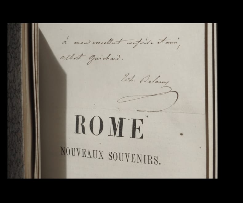 Réunion de deux ouvrage - en édition originale - chacun complet de deux volumes qu'ils doivent respectivement comporter. Ensemble sous reliures uniformes du temps ; chacune signée Abich (???) en queue du dos. Le premier volume des Nouveaux souvenirs est enrichi d'une lettre autographe signé de Théodore Bellamy ; ajouté, au faux-titre à un envoi autographe du même : ''à mon excellent confrère et ami : Abert Guichard / [signature]''. ''Compte-rendu d'un voyage fait en Italie en 1848. ''Le domaine des sensations, des appréciations est sans limite, et présente au coeur, comme à l'intelligence, des horizons infinis''. Il va de Lucques à Florene puis Rome; où il visite les lieux sacrés, musées, mais aussi, la Rome antique. Mais il ne fait pas ici que l'aplogie de Rome ; il peut se montrer critique ; et se plaint à cet égard beaucoup des mendiants, se moque de la pompe parfois bouffonne des manifestations de religiosité, dénigre la ''marchandisation'' progressive des lieux de culte''. Minischetti, Le Voyageur français en Italie au XIXème, pp. 124 et 125 (qui stipule que la BnF ne dispose que du premier volume de la première série. Dos présentant quelques tâches. Quelques claires rousseurs dans les corps d'ouvrage ; dont un volume est toutefois davantage pourvu. Du reste, bonne condition. Rare.