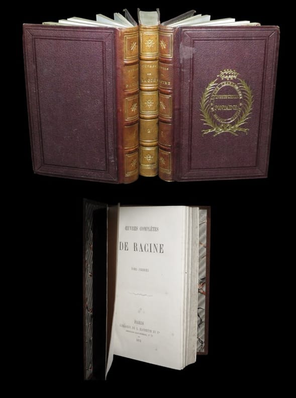 Paris, Librairie de L. Hachette et Cie, 1864. 3 vol. au format in-12 (182 x 118 mm) de 1 f. bl., 2 ff. n.fol., xvi - 458 pp., 1 f. n.fol. et 1 f. bl. ; 1 f. bl., 2 ff. n.fol., 430 pp. et 1 f. bl. ; 1 f. bl., 2 ff. n.fol., 432 pp. et 1 f. bl. Reliures uniformes de l'époque de demi-chagrin maroquiné acajou, quadruple filet gras et maigre à froid encadrant les plats, armes institutionnelles dorées portées au centre des premiers, dos à nerfs ornés de filets gras à froid, filets dorés, triples caissons d'encadrement gras et maigres dorés, fleurons dorés, titre doré, tomaison dorée, tranches mouchetées.
