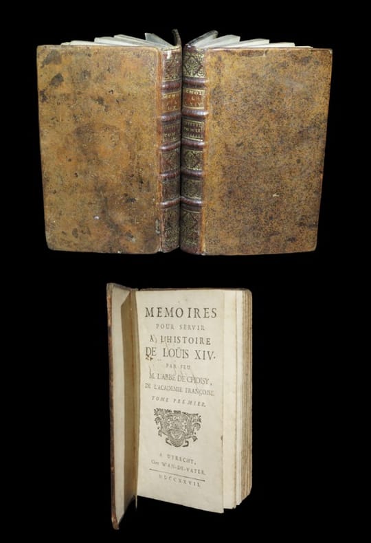 Edition parue à la date de l'originale dépourvue de mention d'édition. Ensemble complet des deux volumes le constituant. Ouvrage posthume, Choisy ''a étoffé ces Mémoires qu'il écrivait pour son seul usage de traits vifs et hardis, sans la craite de déplaire aux courtisans qu'il intéressent. Il rapporte ici d'intéressantes particularités sur la personne du feu Roi et développent parfaitement toute la grandeur d'âme de ce Prince tout en montrant ce qu'il y a eu de répréhensible dans son gouvernement et sa conduite. Ainsi, il loue souvent Louis XIV, le blâme aussi quelquefois et peint ordinairement les Ministres et les favoris avec des traits délicats et malins qui coulent sans peine de la plume d'un homme qui vit à la Cour, et en a pris le style''. Brunet VI, Manuel du libraire et de l'amateur de livres, 23817 - Quérard II, La France littéraire, p. 193 (pour une édition à la même adresse en 3 volumes). Angles légèrement élimés. Coiffes du premier volume arasées. Lequel présente en outre des ors légèrement oxydés. Un cahier bruni dans chacun des volumes. Petit travail de ver en marge supérieure des premiers et derniers feuillets du premier volume (sans toutefois ne jamais atteindre le texte). Du reste, ensemble en bonne condition.
