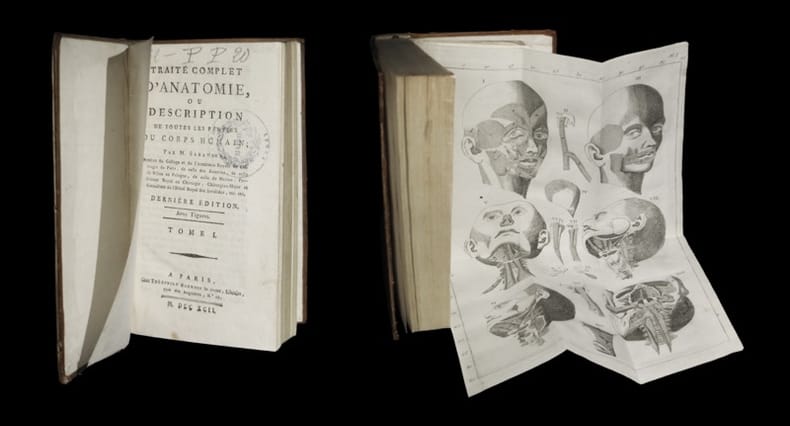 Ensemble complet des quatre volumes le constituant ainsi que de ses 7 superbes grandes planches dépliantes gravées. ''Cet écrit est un des mieux pensés et des plus utiles que nous possédions en ce genre. On y trouve une érudition choisie, et des détails physiologiques qui en rendent la lecture profitable''. (in Quérard). ''L'ouvrage se divise en sept parties, qui sont : l'ostéologie, la myologie, la splanchnologie, l'angéiologie, la névrologie, l'adénologie et l'histoire des téguments.'' Quérard VIII, La France littéraire, p. 290. Angles élimés. Quelques abrasions pouvant affecter les plats. Un dos présente un éclat altéré au niveau de la tomaison. Bonne condition intérieure n'excluant toutefois pas quelques légères marques d'usage. Planches bien conservées ; sinon quelques altérations marginales. Les éditions agrémentées de planches sont peu communes.