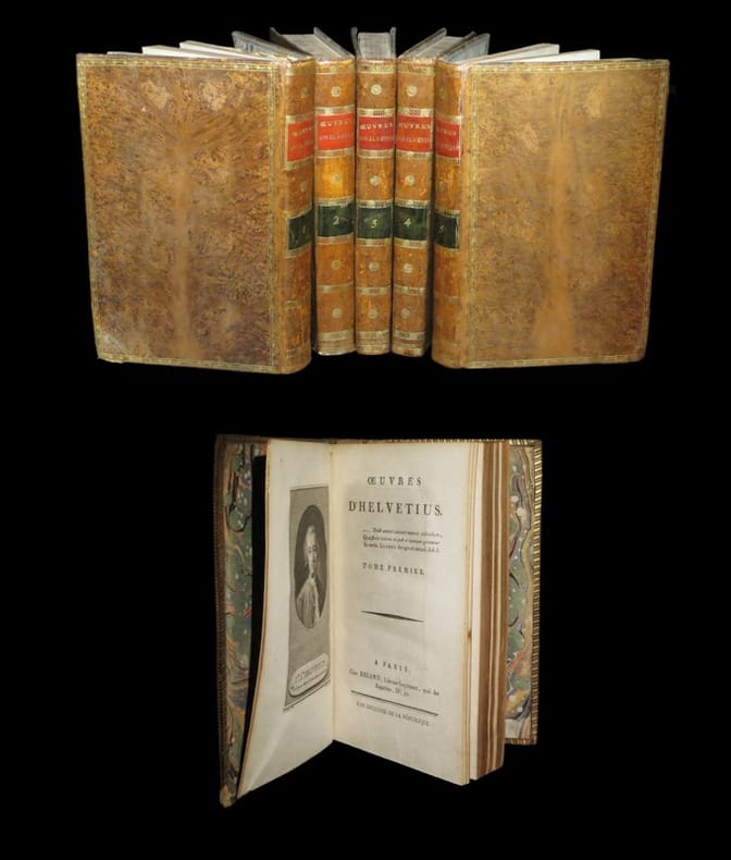 Ensemble complet des 5 volumes le constituant. Le premier s'ouvre sur un portrait-frontispice signé Venloo dans la plaque ; gravé par Macret. Aucune des bibliographies ne mentionne la présente édition, citant chacune (Rahir, Tchémerzine, Brunet, Fournier ou Cioranescu) une édition de 1795 chez Didot ou Serrières. Le premier tome s'ouvre sur un ''Essai sur la vie et les ouvrages d'Helvétius''. ''Claude-Adrien Helvétius s'attira l'affection de Voltaire dès leur première rencontre à Cirey durant l'été 1738. Rejetant le spiritualisme de la métaphysique classique, Helvétius s'est donné pour programme de construire une science de l'homme en transformant l'empirisme de Locke en matérialisme sensualiste. Son livre De l'Esprit développe l'idée selon laquelle le psychisme tout entier résulte des métamorphoses successives de la simple impression sensible. Ainsi la capacité de sentir devient la source de l'activité pensante et de tous les états psychiques, même les plus complexes. Le caractère radical de l'ouvrage d'Helvétius résulte de ce qu'il réduit tout, non seulement à la sensibilité, mais à la sensibilité physique. Puisque tout individu fuit la douleur et recherche le plaisir, le problème social se pose ainsi : créer des conditions propres à faire que tout individu trouve son plaisir à concourir au plaisir d'autrui, c'est-à-dire au bonheur commun. Née d'individus qui, dans la nature, poursuivent leurs intérêts particuliers, la société civile est censée accroître le bien-être de ses membres et adoucir les maux qu'ils doivent endurer. Arrivé à ce point de la démonstration, Helvétius constate que les sociétés sont plus ou moins le produit des circonstances. L'origine de l'inégalité entre les hommes n'est pas à chercher dans leur constitution différente, car Helvétius ne croit pas à l'efficacité d'un déterminisme interne, de type physiologique. Au contraire, il proclame une égalité, voire une identité originaire de tous les esprits. Selon lui, un individu ne se différencie, à sa naissance, par aucun instinct, aptitude, talent ou génie qui lui vienne de sa constitution physique : tout viendra du milieu naturel ou social. L'inégalité entre les hommes n'est pas naturelle, donc fatale, elle est née de leur histoire, elle est un produit des conditions sociales...'' (Gerhardt Stenger). Varet I, Manuel de bibliographie philosophique, p. 390 (pour une édition millésimée 1784 chez Deux-Ponts). Angles élimés. Quelques altérations superficiels sur les plats et frottements affectant les dos. Papier parfois légèrement oxydé. Présence de quelques rousseurs dans les corps d'ouvrages. Nonobstant, belle condition.