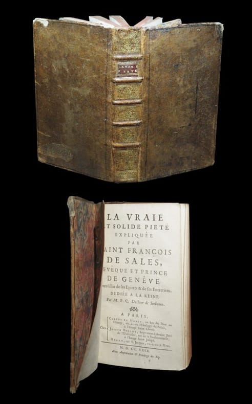 ''Cet ouvrage doit être regardé comme un trésor très riche et très précieux, puisqu'il constitue un précis exact et fidèle de la doctrine de Saint François de Sales''. Quérard II, La France littéraire, p. 254. Angles et coiffes élimés. Abrasions affectant les plats ; avec, au dernier, un petit manque superficiel angulaire. Rares autant que discrètes rousseurs dans le texte. Du reste, bonne condition.