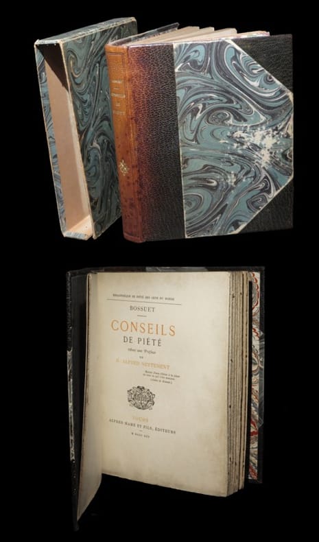 Exemplaire revêtu d'une agréable reliure du temps de demi-maroquin. L'ouvrage témoigne ''des pensées élevées, des sentiments de haute spiritualité, les précieuses semences d'espérance, de foi et d'amour dont les lettres spirituelles de Bossuet sont remplies''. Une arête du coffret désolidarisé. Dos de le reliure passé et tâcheté. Infime déchirure en marge de la page de titre. Petit manque en marge inférieure d'un feuillet. Très rares et claires rousseurs dans le corps d'ouvrage. Du reste, bonne condition.