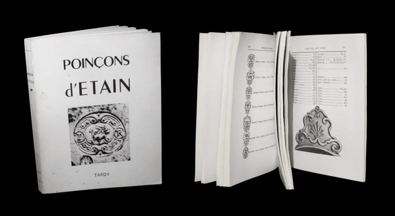 L'ouvrage s'agrémente de la reproduction de nombreux poinçons ainsi que de planches dépliantes in fine. ''Ce volume vous indiquera, de façon pratique, comment il faut lire et interpréter poinçons et marques d'étain, afin de déterminer origine et date des objets d'étain''. Plats présentant un éclat légèrement altéré. Du reste, très belle condition.