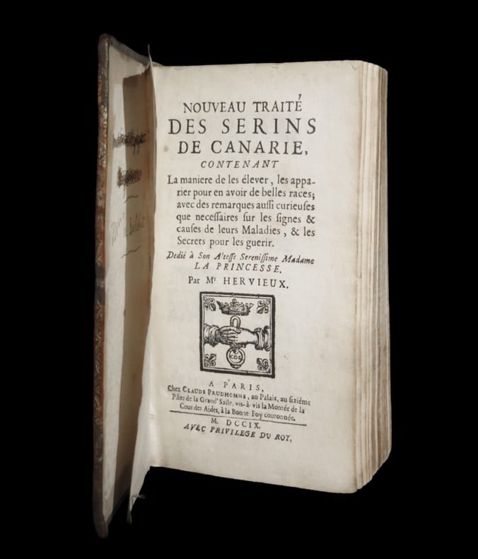 L'ouvrage renferme deux planches. ''Il est nécessaire à ceux qui veulent se délasser par le plaisir innocent des serins, de savoir connaître leurs inclinations, qui sont toutes différentes les unes des autres, la nourriture qui leur est propre, et enfin, leurs maladies. Par la connaissance de leur inclination, l'on remédie ainsi à plusieurs accidents qui leur arrivent, particulièrement lorsqu'on a dessein de les faire couver''. Ronsil, Bibliographie ornithologique, française, 1374. Quelques tâches affectant les plats. Deux petites coupes au dos. Rares rousseurs dans le texte. Infime galerie de ver affectant la marge des derniers feuillets. Du reste, belle condition. Inversion d'un feuillet par le relieur au cahier liminaire.