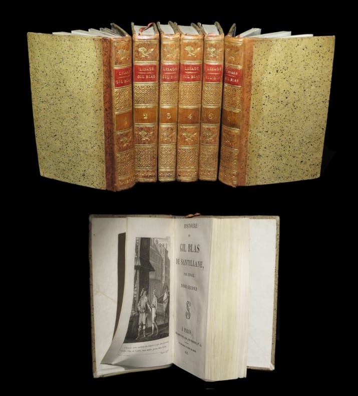 Ensemble complet de ses 6 volumes ; ici revêtus d'agréables reliures du temps. Exemplaire en outre complet de ses 12 jolies planches gravées ; signées Choquet dans la plaque. ''Oeuvre picaresque considérée tel le chef-d'œuvre du roman de moeurs en France, son auteur, en peintre de la société de son temps, compose là une Comédie humaine avant la lettre. Et dresse - sur fond de joyaux d'instructions morales - le portrait de ces valets fripons servant des maîtres voleurs, de ces femmes de mœurs légères, de ces maris trompés et contents, de ces pédants gourmets, de ces poètes ridicules, de ces faux savants ou autres médecins d’une ignorance homicide. La force de ce récit repose en ce que chaque classe, chaque profession se résume à des types et chacun de ces types se peint lui-même dans l’action. Le choix des traits est inspiré par un goût parfait et sont mis en œuvre avec autant de sobriété que de finesse, avec un étonnant souci de vraisemblance.'' Brunet III, Manuel du libraire et de l'amateur de livres, 1006 (pour une édition également chez Didot millésimée 1819). Infimes altérations superficielles affectant les reliures. Très rares et discrètes rousseurs dans le corps d'ouvrage. Du reste, très belle condition.