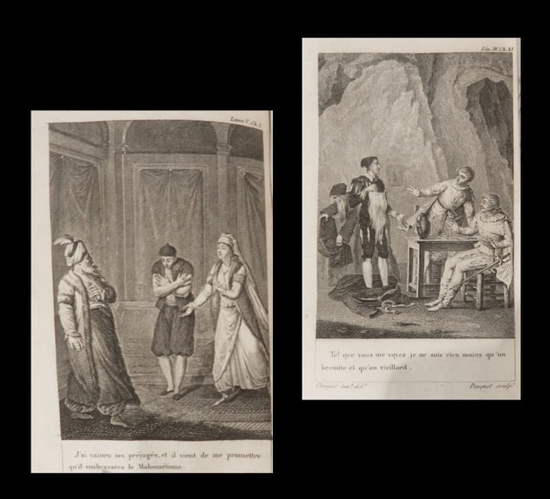 A Paris, chez Genets Jeune / de l'Imprimerie de Didot le Jeune, 1818. 6 vol. au format in-16 (141 x 88 mm) de 1 frontispice gravé n.fol., viii - 277 pp. ; 1 frontispice gravé n.fol. et 319 pp. ; 2 ff. n.fol., 1 frontispice gravé n.fol., 160 pp. et 1 f. n.fol. ; 298 pp. ; 2 ff. n.fol. et 281 pp. ; 2 ff. n.fol., 1 frontispice gravé n.fol. et 281 pp. Reliures uniformes de l'époque de demi-veau moucheté fauve, dos lisses orné d'un double filet d'encadrement doré, filets gras dorés, doubles filets maigres dorés, larges fleurons dorés, entrelacs de filets en pointillés dorés formant moucharabiehs, semis d'étoiles et de cercles dorés, pièces de titre de maroquin vieux-rouge, titre doré, tomaison dorée, tranches jaunes.