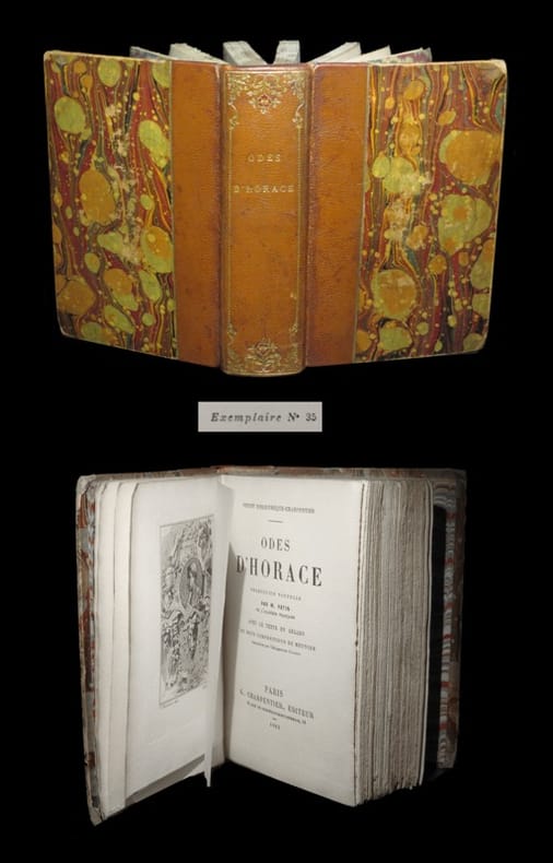 Exemplaire revêtu d'une délicate reliure mosaïquée du temps. Tirage de tête : un des 75 premiers exemplaires du tirage numéroté sur Hollande (seul papier). L'ouvrage est complet de ses deux délicates eaux-fortes signées V. Meunier dans la plaque. Texte en latin avec la traduction française de M. Patin en regard. On a tour à tour salué dans les Odes, l'exploit métrique, l'équilibre dans une harmonieuse architecture qui se déploie selon des proportions numériques aussi complexes qu'impeccables, la circulation, les interconnexions, les réseaux, les correspondances, les combinaisons et les symétries diverses, dont l'ensemble constitue une immense et ultrasensible chambre de résonance. Quant à l'incroyable virtuosité verbale qui tire du choix et de la place de chaque mot le maximum d'énergie possible, elle impressionnait Friedrich Nietzsche au plus haut degré par ce qu'il appelait sa «noblesse». «Jusqu'à présent aucun poète ne m'a procuré le même ravissement artistique que celui que j'ai éprouvé dès l'abord à la lecture d'une ode d'Horace. Dans certaines langues il n'est même pas possible de vouloir ce qui est réalisé ici. Tout le reste de la poésie devient, à côté de cela, quelque chose de populaire, — un simple bavardage de sentiments...» (Nietzsche, Le Crépuscule des idoles). Mais là où Horace se surpasse, c'est dans la maîtrise du contenu. En apparence pourtant, rien de plus hétéroclite que les Odes. Où semblent interférer de manière aléatoire la sphère privée et la sphère publique, les amours et la politique, le monde grec et le monde latin, la mythologie et l'actualité la plus brûlante, l'épicurisme poussé jusqu’au sybaritisme, ou encore, un stoïcisme aiguisé jusqu’à l'ascétisme. Vicaire I, Manuel de l'amateur de livres du XIXème, 614 (ne faisant pas cas d'un tirage sur grand papier). Angles et coupes élimés. Mors présentant quelques frottements. Papier très légèrement oxydé. Quelques claires rousseurs dans le corps d'ouvrage. Du reste, bonne condition.