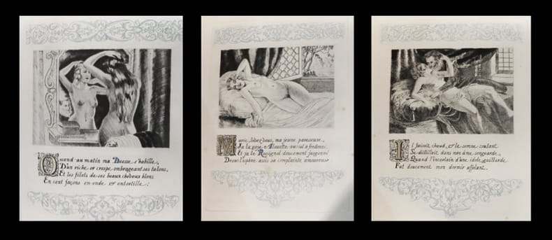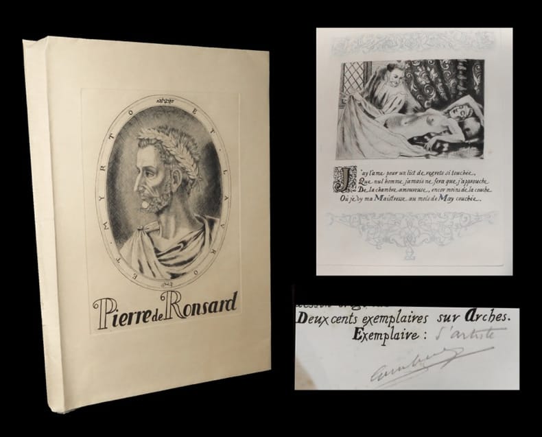 Tirage unique à 220 exemplaires seulement de cette ''édition recherchée''. (in Carteret). Celui-ci comptant parmi les 200 exemplaires du tirage sur Arches ; justifié au colophon exemplaire d'artiste et revêtu de la signature autographe à la mine de plomb de Léon Courbouleix. ''Ce livre contient [dont premier plat de couverture] 59 planches, dont les ornements, le texte et les illustrations ont été gravés à l'eau-forte. Chaque planche a été imprimée à la poupée en plusieurs couleurs sur la presse à bras de l'artiste. Les lettres capitales ont été rehaussées de gouache et d'or à la main''. ''Léon Courbouleix grava à la pointe-sèche et à l'eau-forte des illustrations pour des auteurs libertins, notamment pour l'éditeur Maurice Glomeau''. (in Osterwalder, citant la présente contribution de l'artiste). «Prince des poètes et poète des princes», Pierre de Ronsard est une figure majeure de la littérature poétique de la Renaissance. Auteur d’une œuvre vaste qui, en plus de trente ans, a touché aussi bien la poésie engagée et «officielle» dans le contexte des guerres de religions avec Les Hymnes et les Discours (1555-1564), que l’épopée avec La Franciade (1572) ou la poésie lyrique avec les recueils Les Odes (1550-1552) et des Amours (Les Amours de Cassandre, 1552; Les Amours de Marie, 1555; Sonnets pour Hélène, 1578). Imitant les auteurs antiques, Ronsard emploie d'abord les formes de l'ode (Mignonne, allons voir si la rose) et de l'hymne, considérées comme des formes majeures, mais il utilisera de plus en plus le sonnet transplanté en France par Clément Marot en 1536 en employant le décasyllabe (Mon dieu, mon dieu, que ma maistresse est belle! , Les Amours, ou Je vous envoye un bouquet…, Continuation des Amours) comme le mètre «moderne» de l'alexandrin (Comme on voit sur la branche… Second livre des Amours, ou Quand vous serez bien vieille…, Sonnets pour Hélène). Monod II, Manuel de l'amateur de livres illustrés modernes, 9902 - Osterwalder III, Dictionnaire des illustrateurs, p. 419 - Carteret IV, Le Trésor du bibliophile / Illustrés modernes, p. 347. Petite coupe au dos de l'exemplaire. Rousseurs dans le corps d'ouvrage. Du reste, belle condition.