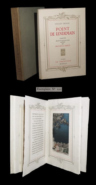 VIVANT-DENON.Point de lendemain. Conte.Paris, Editions de la Mappemonde, 1934. Petit in-8°, superbe reliure demi-maroquin à gros grains à coins, tête dorée, couvertures et dos conservés. Illustrations en couleurs de Calbet. Exemplaire numéroté sur Rives. Avec un texte d'Anatole France et une introduction de Fernand FleuretTrès bel exemplaire sur papier de Rives, ici le n°21