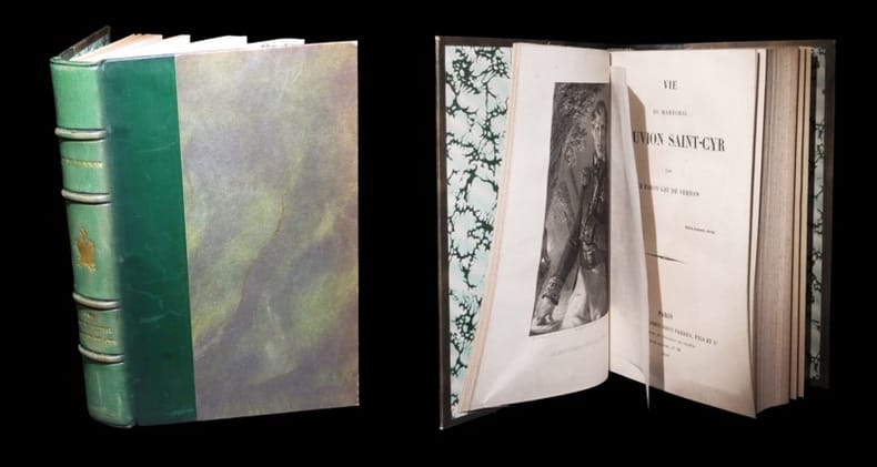 Edition originale. Exemplaire complet de son joli frontispice gravé en lithographie et signé Horace Vernet dans la plaque. ''Saint-Cyr a été grand par la guerre et grand pendant la paix : ministre d'une monarchie constitutionnelle, il n'a eu d'entrailles et de pensées que pour le bien du pays ; historien dogmatique et profond, il a mérité qu'on ait dit de lui, comme de César, qu'il avait fait la guerre et qu'il l'avait écrite avec le même esprit. Mais il n'a pas raconté toute sa vie de général d'armée et d'homme d'état''... Martin & Pigeard, Bibliographie napoléonienne, p. 423. Dos passé présentant en outre de très discrets frottements. Tâches angulaires au faux-titre. Rares autant que discrètes rousseurs dans le corps d'ouvrage. Du reste, belle condition.