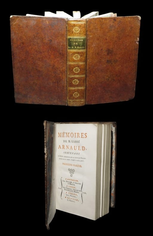Edition originale. Ensemble complet de ses trois parties ; ici reliées en un volume. ''L'Abbé d'Aranuld, né en 1616, était l'aîné des fils du célèbre M. Aranuld d'Andilly. Il servit dans le Régiment des Gardes avant de se mettre en qualité de volontaire dans le corps des Carabins de France, sous Isaac Arnauld. Puis il devint Capitaine d'Infanterie sius M. le Comte de Pas-Feuquières. Le Roi le gratifia en 1674 de l'Abbaye de Chaumes en Brie''. Brunet I, Manuel du libraire et de l'amateur de livres, 489 (mentionnant une édition à la même date en deux parties seulement). Angles élimés. Petite altération superficielle en marge droite du premier plat. Claires rousseurs dans le corps d'ouvrage. Du reste, très belle condition.