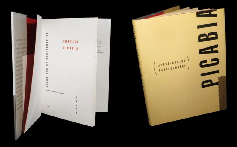 Illustré de 3 dessins mécaniques hors-texte par G. Ribemont-Dessaignes. Édition originale. Un des 50 exemplaires sur pur fil Lafuma réimposés, tirage de tête après 10 Chine. Introduction de Gabrielle Buffet. Le livre devait dans un premier temps être publié par Grasset, mais Picabia écrit le 31 juillet 1921 à Breton : «Mon petit livre va paraître au Sans Pareil, je pense. Il m’a été absolument impossible de m’entendre avec B. Grasset; cet homme est charmant, mais peu audacieux, il considère que mon livre ne pourrait être lu par sa clientèle tel qu’il est. Avec beaucoup de modifications, cela ferait une œuvre très bien, probablement». Mais une semaine plus tard, les mêmes problèmes se posent avec René Hilsum qui demande également des changements dans le texte et un autre titre pour pouvoir le publier. Ne voulant pas céder, Picabia fait paraître Jésus-Christ Rastaquouère à compte d’auteur en gardant le label de la Collection Dada qu’utilisait déjà le Sans Pareil et met l’ouvrage en vente chez Jacques Povolszky à la Librairie-Galerie La Cible. Cet incident marque le début de la scission entre Hilsum et les dadaïstes que l’éditeur avait soutenus dès le début. E. Hutin; P. Fouché, Au Sans Pareil, p. 22 et suiv.; Dada Global n° 211.