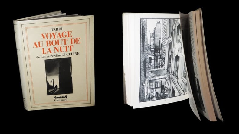 Pour ce premier roman, Céline s'inspira principalement de son expérience personnelle. Il avait en effet participé à la Première Guerre mondiale et celle-ci lui révéla l'absurdité du monde, allant même jusqu'à la qualifier «d'abattoir international en folie». Céline expose ainsi ce qui est pour lui la seule façon raisonnable de résister à une telle folie: la lâcheté. Il est hostile à toute forme d'héroïsme, celui-là même qui va de pair avec la guerre. Pour lui, la guerre ne fait que présenter le monde sous la forme d'un gant, mais un gant que l'on aurait retourné, et dont on verrait l'intérieur, ce qui amène à la trame fondamentale du livre: la pourriture et sa mise en évidence... Ici, superbement servi par les compositions de Tardi. Dos passé. Du reste, très belle condition.
