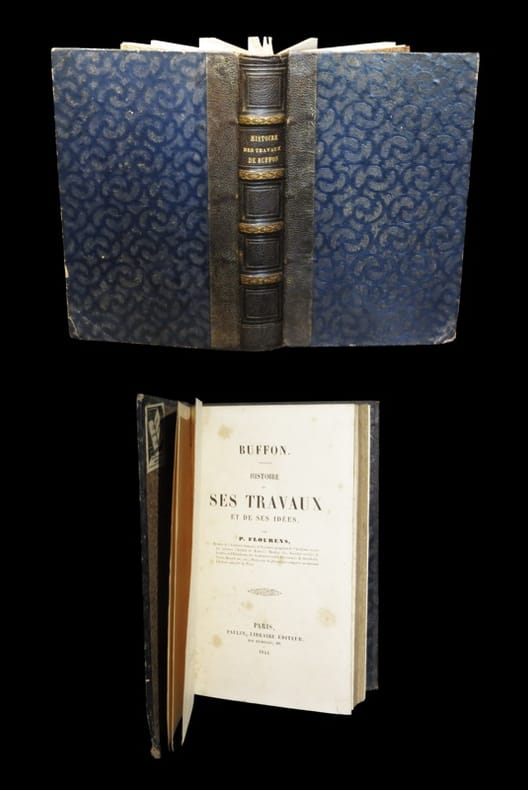 Edition originale. Exemplaire revêtu d'une agréable reliure du temps. Table : Idées de Buffon sur la méthode - L'économie animale - Système de Buffon sur la génération - Idées sur le dégénération des animaux et la mutabilité des espèces - Fixité des espèces - Lois de la fécondité - Intelligence de l'homme et mécanisme des bêtes - Variétés de l'espèce humaine - Théorie de la terre - Système de Buffon sur la formation des planètes - Epoques de la nature - Du caractère propre de Buffon, considéré comme historien de la terre - Philosophie générale de Buffon - Vie de Buffon - Lettres. Angles et coupes légèrement élimés. Claires rousseurs dans le corps d'ouvrage. Plissure angulaire affectant un feuillet. Discrète cerne claire dans le corps d'ouvrage. Du reste, bonne condition.