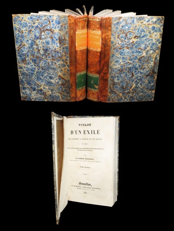 Le baron d'Haussez, exilé, visita outre la Hollande, la confédération germanique, l'Autriche, mais surtout l'Italie: le Royaume Lombardo-vénitien, les États romains, le duché de Modène, le royaume de Sardaigne, le grand duché de Toscane, le royaume de Naples et la Sicile. Le récit est plein d'intéressantes observations sur la situation économique et politique des différents États italiens, résultat d'un oeil très attentif : celui d'un homme politique conservateur, mais plein d'esprit critique. Dans ce voyage, le tableau politique, économique et social des différents États italiens que l'auteur décrit est très aigu, loin d'une vision folklorique basée sur des clichés. L'ouvrage se termine avec une "Excursion en Maurienne et en Savoie" en appendice, avec un dernier chapitre consacré à Chamouny, "pour grimper sur la Fraigère et sur le Montanvert", avec la description d'une impressionnante avalanche.Très rare édition genevoise parue la même année que l'originale Reliures épidermées, petite déchirure au dernier feuillet du tome second (sans manque). Menichelli, Viaggiatori Francesi in Italia, 794; Bibliographie du voyage français en Italie, p. 313.