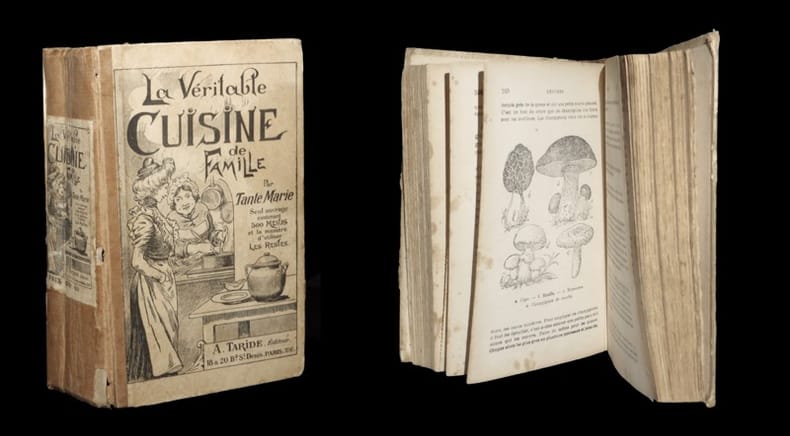 L'ouvrage s'agrémente de figures et illustrations hors-texte. ''Ce livre de cuisine s'adresse aux intérieurs modestes où l'on est obligé de compter avec le temps et l'argent. Chacune des recettes ici présentée l'est en termes simples et compréhensibles pour les personnes les plus étrangères à la cuisine''. La maîtresse de maison, forte de ce livre, n'aura ainsi plus sempiternellement besoin de demander à son époux - qui lui aurait de toute façon inmanquablement répondu ''ce que tu voudras'' - ce qu'elle pourrait bien faire à dîner... Table : Termes de cuisine - Service de la table - Sauces - Potages - Hors-d'oeuvre - Viandes et volailles - Poissons et coquillages - Oeufs - Macaroni - Ebtrements sucrés - Pâtisseries - Compotes - Confitures - Conserves de fruits - Bonbons - Sirops - Liqueurs - Fruits à l'eau de vie - Thé - Café - Chocolat - Boissons - Vins - 500 menus - Table alphabétique. Rousseurs affectant les plats. Mors du second plat fragilisé. Un petit manque superficiel en queue du dos. Piqûres éparses dans le corps d'ouvrage.