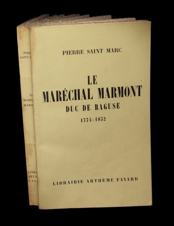 Edition originale s'ouvrant sur un frontispice. ''Marmont a participé à l'épopée impériale et, à son actif, il convient de retenir sa bravoure, sa science de la manoeuvre ; son rôle brillant à Marengo, après Wagram, à Leipzig, pendant la campagne de France et la défaite des Arpilles en 1812 en Espagne, ne saurait être en bonne justice lui être imputée''. Pigeard & Martin, Bibliographie napoléonienne, p. 820. Dos très légèrement creusé présentant en outre de discrètes tâches. Décharge d'adhésif affectant le premier et dernier feuillets. Du reste, très belle condition.