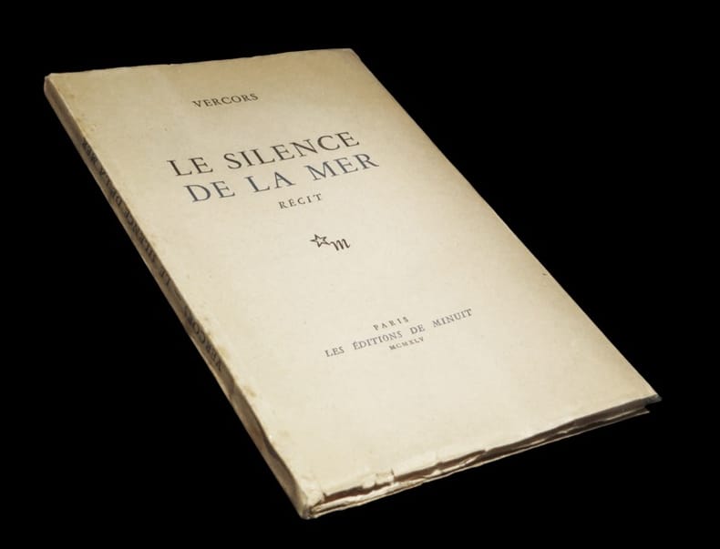 Jean Bruller s'engage dans la Résistance aux côtés de Pierre de Lescure : ils sont chargés de réaliser, pour l'Intelligence Service, un réseau de renseignements et de filières d'évasion d'agents et d'aviateurs anglais. Le réseau découvert, ils écrivent ensuite des articles pour une revue communiste clandestine, La Pensée libre, qui souhaite s'ouvrir à des rédacteurs de toutes tendances. Lescure a rédigé lui-même une nouvelle et pousse Bruller à en écrire une à son tour, lui qui s'est réfugié dans le silence de son village de Villiers-sur-Morin. Un silence trop pesant pour l'illustrateur, qui se change, en quelques semaines, en écrivain et rédige Le Silence de la mer. La rédaction est terminée à la fin de l'été 1941 et Vercors en fait la première lecture à son ami Lescure : « pendant plus d'une heure il resta impassible... Enfin il releva la tête, posa sur moi un regard brouillé, humide, et prononça : ‘De longtemps je n'avais plus ressenti une pareille émotion' ». Reste à le publier. Sous pseudonyme évidemment, déjà trouvé : « Jean Bruller se trouvait à l'Armée des Alpes, du côté de Romans-sur-Isère, lorsque l'armistice de juin 1940 fut annoncée. Son regard se posa sur les monts du Vercors dans lequel il vit, avec la prescience du poète, une citadelle de Liberté. De sorte que le nom de ‘Vercors' se présenta à son esprit quand il eut à signer d'un pseudonyme significatif le premier des écrits français que la résistance ait inspiré » (Jacques Dalloz). Par l'intermédiaire de l'imprimeur Ernest Aulard, Bruller trouve à Paris un petit atelier boulevard de l'Hôpital, celui de Georges Oudeville, spécialisé dans les faire-part et les cartes de visite. Bruller envisage un livre de petit format, d'une centaine de pages, à la finition soignée. Aulard fournit papier et caractères. La machine, une minerve, ne permettant de tirer que huit pages à la fois, le travail d'impression prend près de trois mois et, chaque semaine, Bruller apporte huit pages du manuscrit, détruites au fur et à mesure de l'avancement de la composition, et repart avec les pages imprimées, qui sont déposées boulevard Raspail, dans des bureaux où travaille une amie de Lescure, puis, après une perquisition allemande, dans un café, boulevard de la Gare. Fin janvier 1942, le travail de presse est achevé. Yvonne Paraf, une amie de Bruller, se charge du brochage et Vercors lui-même collera les couvertures. Le résultat est un livre de qualité, à la typographie parfaite. Bruller a fait, comme il le dit lui-même, de « la belle ouvrage ». En février 1942, 350 exemplaires sont constitués : 100 pour la zone Nord, rapidement diffusés sous le manteau, et 250 pour la zone Sud : 200 exemplaires seront saisis par les Allemands alors qu'ils transitaient vers Lyon. Personne ne soupçonnera jusqu'en 1945 qu'il est l'auteur de son livre (ni Aulard ni Oudeville ni même sa propre épouse ne sont au courant) et les rares initiés, une petite dizaine, garderont le secret. En raison de cette diffusion réduite - seuls 150 exemplaires purent être distribués -, le coup d'éclat demeure sans lendemain dans un premier temps. Mais, très vite, au gré des multiples rééditions clandestines qui vont suivre, d'abord à Londres, puis en Suisse, en Afrique du Nord, aux États-Unis, au Liban et jusqu'au Sénégal, Le Silence de la mer devient vite le texte emblématique de la Résistance, au même titre que son pendant poétique, « Liberté » d'Éluard. Les deux titres seront par ailleurs réunis dans le numéro 4 de La Revue du monde libre, édité en avril 1943 à Londres. Très bel exemplaire, en parfaite condition.