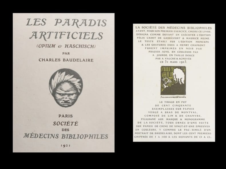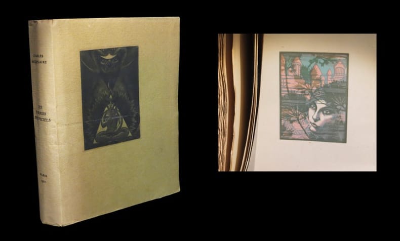 ''Edition recherchée''. (in Carteret). Tirage unique à 150 exemplaires seulement. Celui-ci, imprimé nominativement pour Funck-Brentano. Un des 100 exemplaires du tirage numéroté sur vergé filigrané de Montval. Exemplaire bien complet de sa suite (volante) sur Chine de 20 (sur 21) compositions hors-texte en couleurs gravées en taille-douce ainsi qu'un portrait de Baudelaire attribué à Monticelli. Le premier plat de couverture est agrémenté d'une eau-forte gravée à la manière noire. Outre les planches en couleurs figurant dans l'ouvrage, l'iconographie est complétée par de jolis bandeaux figuratifs en xylographie par Henry Chapront. ''Collaborateur à la revue Floréal, Chapront entreprend surtout d'illustrer pour les éditions La Connaissance ou à l'Enseigne du pot cassé une vingtaine d'oeuvres très fin-de-siècle ou classiques. Parfait décorateur du livre, il sait exprimer avec esprit tout le sel, souvent gaulois, jamais inconvenant''. (in Osterwalder). ' 'Cet artiste, qui très jeune fut mêlé aux milieux symbolistes a collaboré à de nombreuses publications littéraires avant d'être recherché par les éditeurs de livres de luxe''. (in Bénézit). Monod I, Manuel de l'amateur de livres illustrés modernes, 1132 - Carteret IV, Le Trésor du bibliophile / Illustrés modernes, p. 64 - Osterwalder II, Dictionnaire des illustrateurs, p. 241 - Bénézit II, Dictionnaire des peintres, p. 666. La suite est lacunaire de sa première planche (un portrait de Baudelaire). Exemplaire constellé de pâles rousseurs. Infime manque en marge d'une des planches de la suite. Nonobstant, belle condition.
