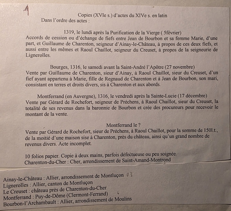 - 1319, le lundi après la Purification de la Vierge, Accords de cession de fiefs... à propos de a seigneurie de Lignerolles. - 1319, Bourges...vente d'un fief - 1316 Montferrand (en Auvergne)... - Montferrand, vente par Gérard de Rochefort