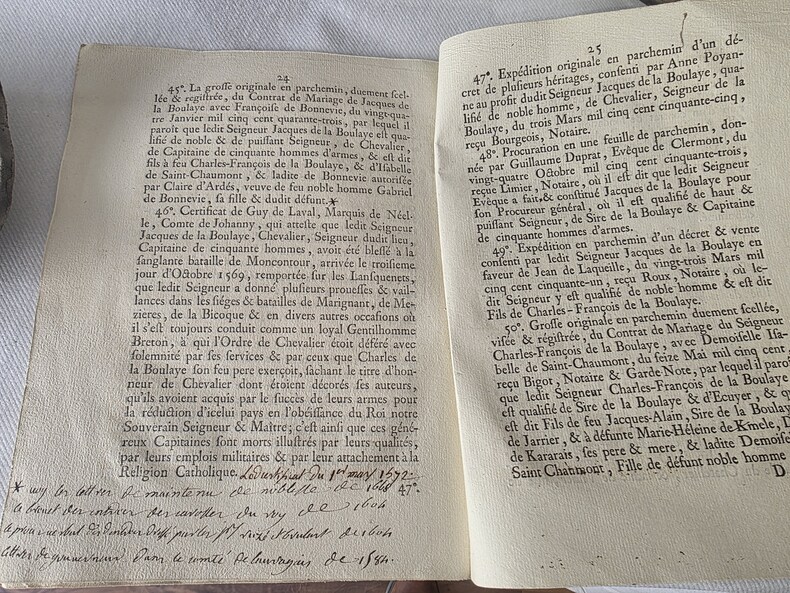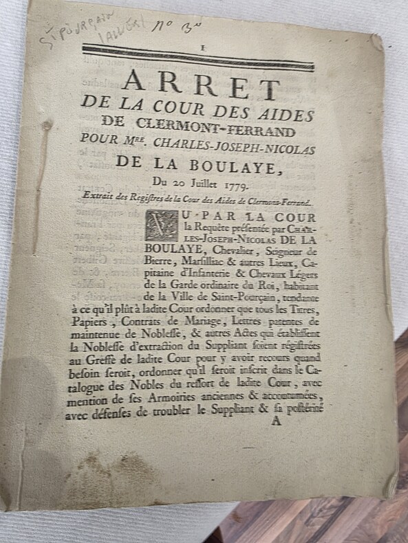 20 juillet 1779 Arrêt de la Cour des Aides des Clermont-Ferrand pour établir la noblesse d'extraction de Madame Charles-Joseph-Nicolas de la Boulaye, avec description et énumération de tous les titres produits dans ladite requête.