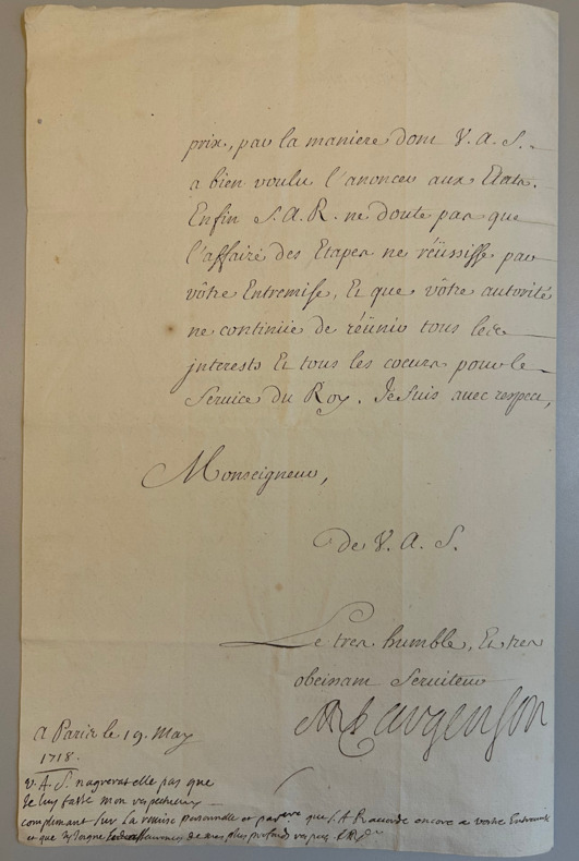 Lettre signée du Marquis d’Argenson, ministre d’état, datée du 19 mai 1718 ( adressée au Duc de Bourbon qui est désigné par << Son altesse sérénissime, Monseigneur le Duc >>), à propos de la <<tenue>> des états de Bourgogne. (Marc - René de Voyer de Paulny d’Argenson (1652-1721), ministre d’état et lieutenant géneral de Police de 1697 à 1728, principal adversaire des Jansénistes) 1 Pièce papier, double feuille 21 x 31 cm, signature autographe, 4 lignes autographe de Marquis En fin de lettre