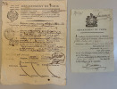 Certificat de non émigration, en date du 21 nivôse an II (10 Janvier 1794 ) délivré à Madeleine- Laure de Sade, résidant à Paris , rue de la Madeleine, N° 1069. Laissez-passer en date du 16 prairial an III (4 de juin 1795) délivrée par la section de la place Vendôme de l’administration de Paris à Madeleine- Laure de Sade, pour se rendre à Verrières. Arrivée le 21 prairial (9 juin ) et départ de Verriéres le 6 thermidor an III (24 juillet 1795). Le certificat de non émigration était bien sur nécessaire pour éviter d’être mis en état d’arrestation, et un laissez-passer, tout aussi nécessaire, même pour se rendre de Paris à Verrière ( Verrière -le-Buisson, département de Seine -et-Oise, actuellement Essonne), où le président de Montreuil, grand-père de Madeleine-Laure, possédait une résidence. On notera l’adresse : << Laure-Madeleine fille Sade, chez sa mère rue de la Madelaine N°1069>>, ainsi que la description physique : << Vingt trois ans, taille 5 pieds 1pouce (environ1m.65); cheveux et sourcils châtain, yeux gris bleu, nez moyen, bouche moyenne, menton relevé, front ordinaire, visage plein…>> 2 pièces papier, 1794-1795