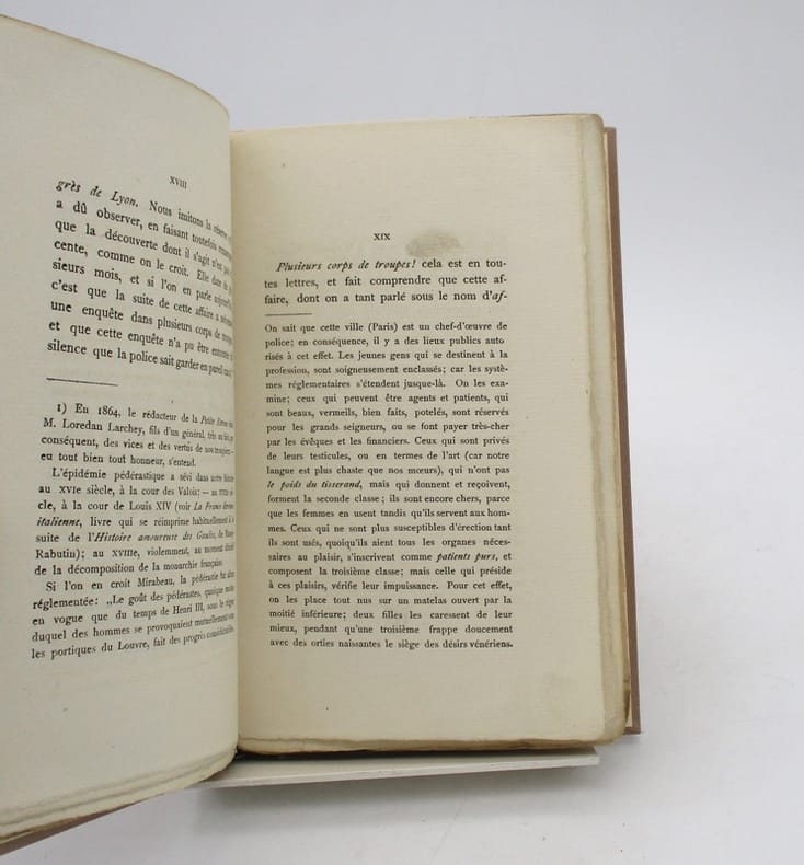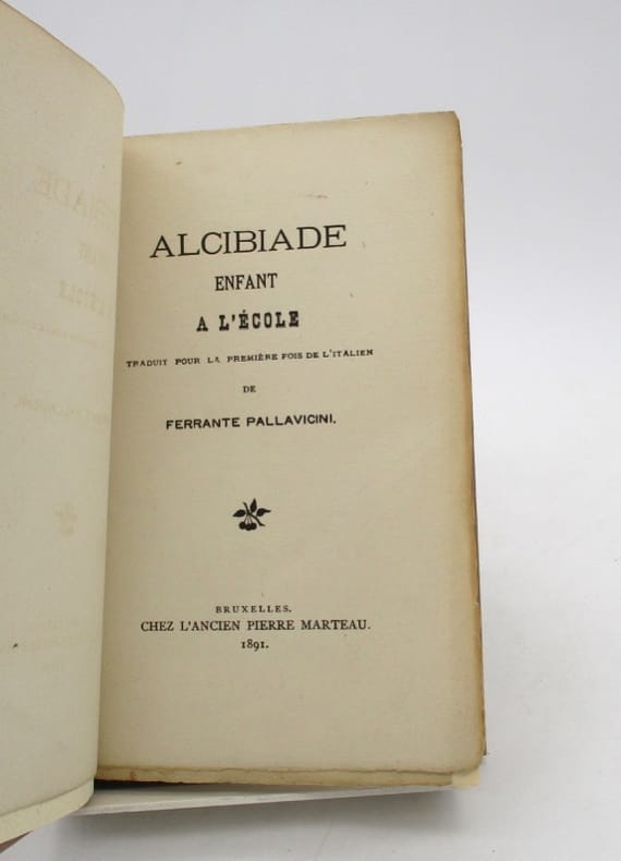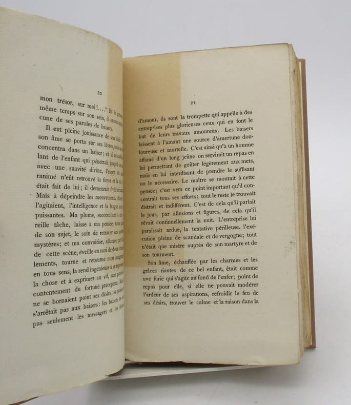Célèbre ouvrage érotique datant de 1652. Ce petit chef-duvre conte avec un joyeux cynisme lentreprise de séduction dun maître envers son élève. Cest certainement le premier écrit érotique homosexuel imprimé en Occident. Cette traduction a été condamnée à la destruction comme contenant des outrages à la morale publique et religieuse. Notre édition est une variante de lédition publiée en 1891 par Bergé à Rotterdam, elle paraît être non répertoriée.Très recherché.* Dutel, II, 9.* Voir photographie(s) / See picture(s). * Membre du SLAM et de la LILA / ILAB Member. La librairie est ouverte sur rendez-vous.