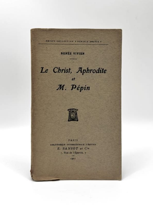 E. Sansot & Cie "Paris, 1907, petit in-12 couronne, petite collection ""scripta brevia"", bradel plein papier moderne, pièce de titre de cuir orange. Plats de couverture et dos conservés. Reliure signée de Marion Blin. 80pp.-6ff. de catalogue de l'éditeur. Edition originale sur papier d'édition après 10 exemplaires sur Japon. Parfait état. Ce tout petit ouvrage réuni deux courts textes intitulés : Jésus-Christ et le reporter, et, La seconde naissance d'Aphroditue, parus en octobre et décembre 1906 dans Le Censeur, revue politique et littéraire tout juste fondée par Ernest-Charles. ""Malgré cela [le peu de succès que rencontra l'ouvrage] Le Christ, Aphrodite et M. Pépin constitue avant tout une critique du journalisme. Vivien y suit la tradition inaugurée par Poe et Baudelaire, , et brillamment continuée par Villiers de l'Isle Adam et Marcel Schwob, lequel avait publié, en 1903, ses féroces Moeurs des diurnales. ""J.P. Goujon ""Tes blessures sont plus douces que leurs caresses. Vie de Renée Vivien p.342"