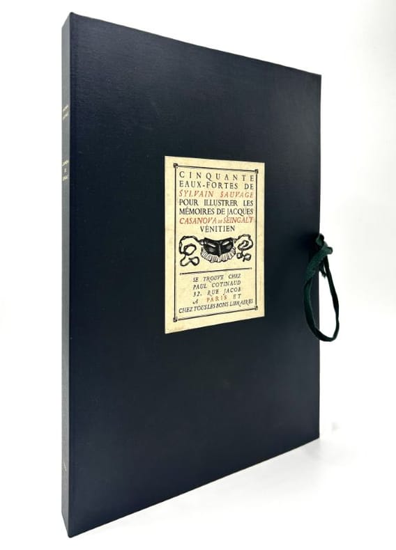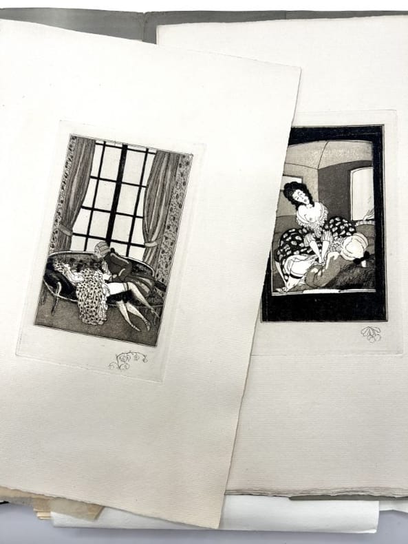 Paris Paul Cotinaud In-8, 50 pages en feuilles. Portefeuille éditeur cartonné, vignette de titre sur le premier plat, rubans verts, titre doré au dos. Recueil de 50 eaux-fortes en nuances de gris. Un des 50 exemplaires sur Japon pourvu des 10 planches "refusées". Portefeuille et intérieur en très bon état.* Curiosa, Erotica. * Voir photographies / See pictures