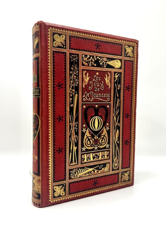 Paris, Librairie Hachette et Cie 1885 In-8. Cartonnage éditeur pleine percaline rouge, plats biseautés, premier plat orné d’un superbe décor noir et doré représentant divers matériels de jeu, dos lisse orné, tranches dorées, gravures et croquis noir et blanc dans le texte et hors texte, 450 pp. Bel exemplaire.