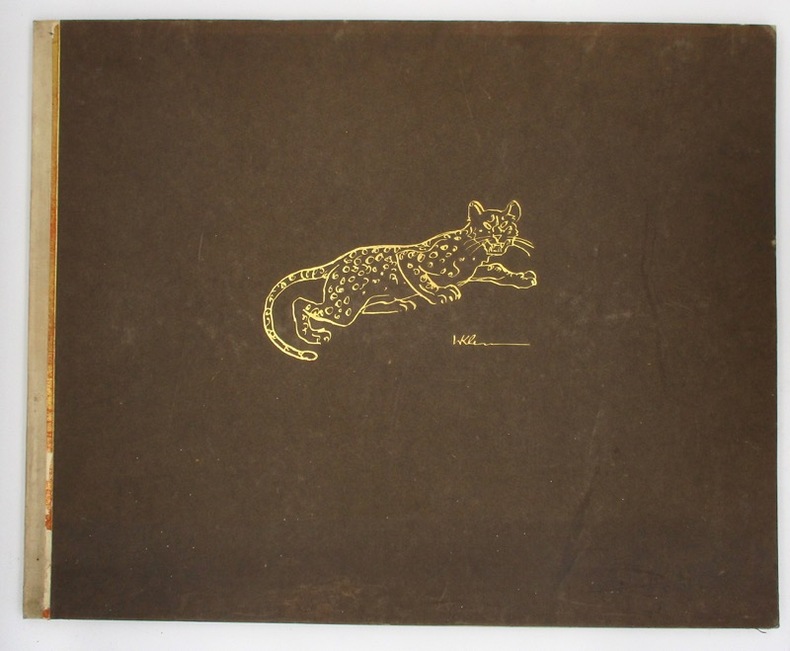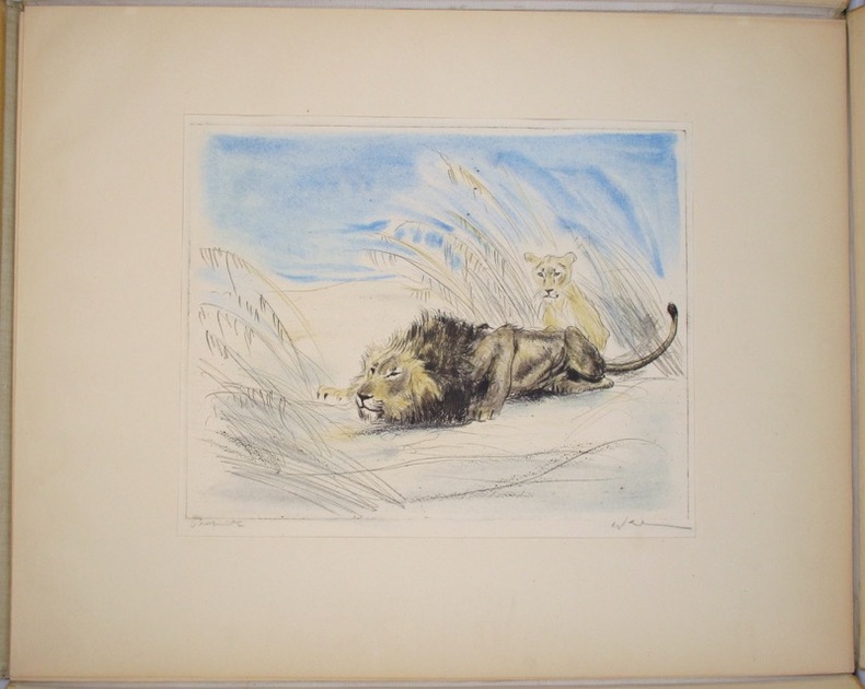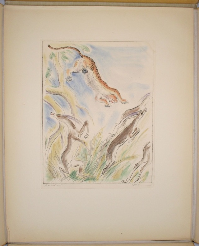 Slnd (Weimar, vers 1925). Grand in-folio, chemise cartonnée reliure demi-velin, titre doré au dos, premier plat estampé et doré, 5 gravures en couleurs sous marie-louise et contresignés. / Oblong elephant portfolio, quater-vellum binding, gilt title on back, 5 color engravings under marie-louise and countersigned.