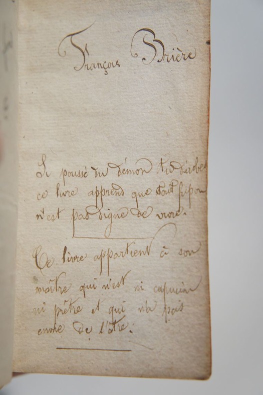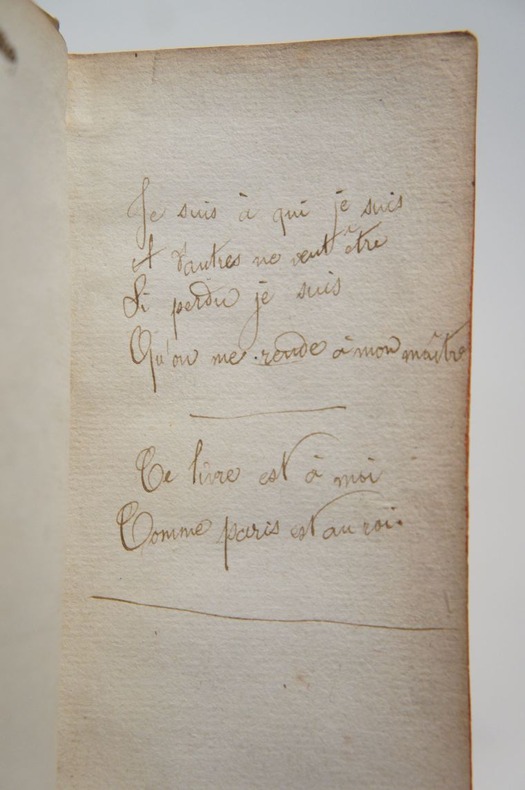 Amusantes inscriptions manuscrites sur les premiers feuillets blancs, signés François Brière : « Je suis à qui je suis / A d'autres ne veut être / Si perdu je suis / Qu'on me rende à mon maître », ou encore : « Ce livre est à moi / Comme Paris est au Roi ». * Voir photographie(s) / See picture(s). * Membre du SLAM et de la LILA / ILAB Member. La librairie est ouverte sur rendez-vous.