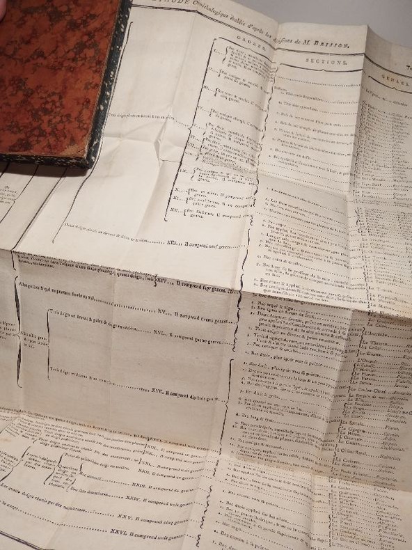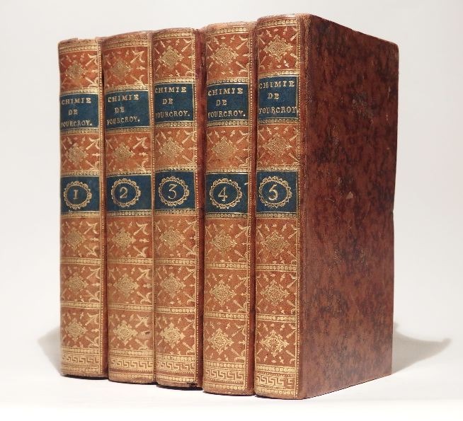 Cinquième édition. Par A. F. Fourcroy, Médecin et Professeur de Chimie.A Paris, chez Cuchet - L'An II de la République (1794). Contenant 10 tableaux dépliants, reliés in fine du T5.Premier Tableau : Division et Caractères des huit Classes d'Animaux par M. Daubenton.Deuxième Tableau : Quadrupèdes suivant la Méthode de M. Brisson.Troisième Tableau : Méthode Ornithologique établie d'après les divisions de M. Brisson.Quatrième Tableau : Division des Quadrupèdes Ovipares, par M. Daubenton.Cinquième Tableau : Table méthodique des Quadrupèdes Ovipares par M. De La Cépède.Sixième Tableau : Division des Serpens, par M. Daubenton.Septième Tableau : Méthode Ichtyologique de M. Gouan.Huitième Tableau : Méthode Entomologique de M. Geoffroy.Neuvième Tableau : Tableau systématique des Vers, par M. Brugnière (Extrait de la Nouvelle Encyclopédie).Dixième Tableau : Tableau de la Nomenclature chimique, proposée par MM. De Morveau, Lavoisier, Bertholet et De Fourcroy, en mai 1787.Reliure pleine basane marbrée de l'époque. Dos à nerfs orné avec pièces de titre et de tomaison. Tranches rouges. Petits manques à 2 coiffes. Epidermures sur les plats. Pas de rousseur. Bon état. Format in-8°(21x13).